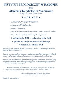 W związku z sytuacją epidemiczną najbliższe zajęcia dydaktyczne w Instytucie Teologicznym w Radomiu 21 stycznia br. w piątek odbędą się jedynie w formie zdalnej. Linki będą podane na skrzynki e-mail studentów.