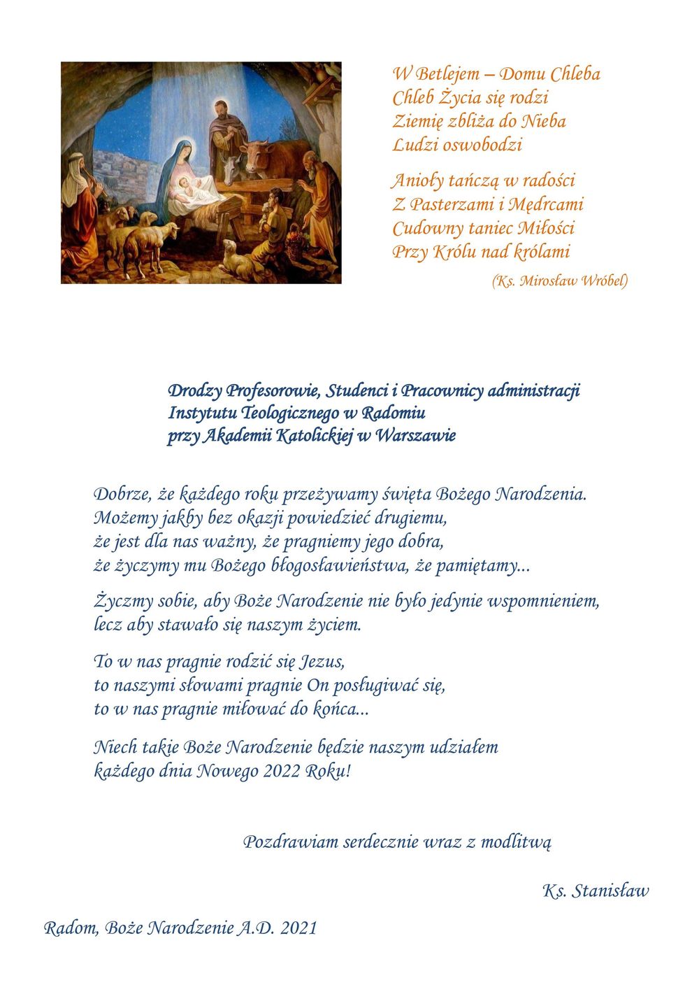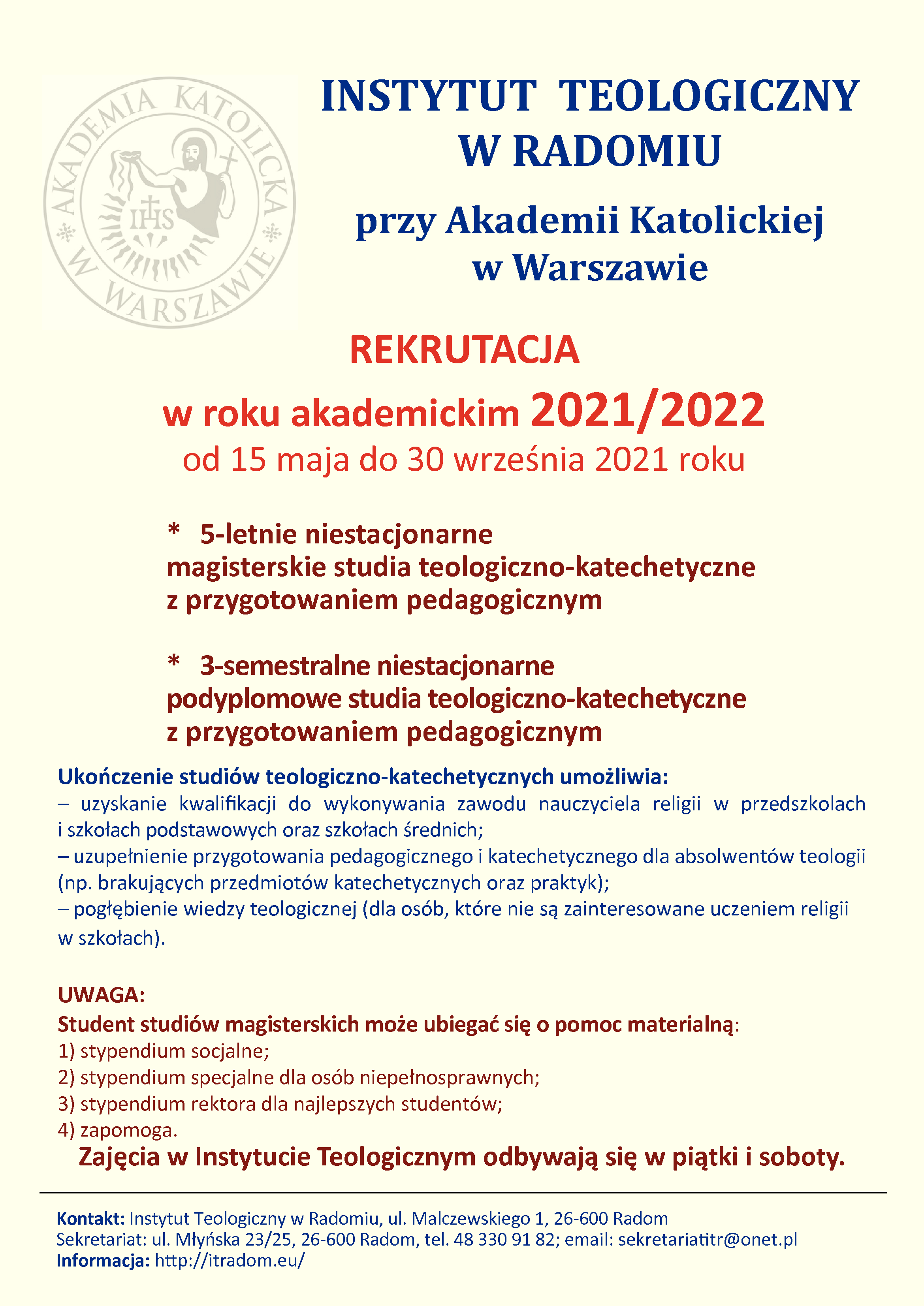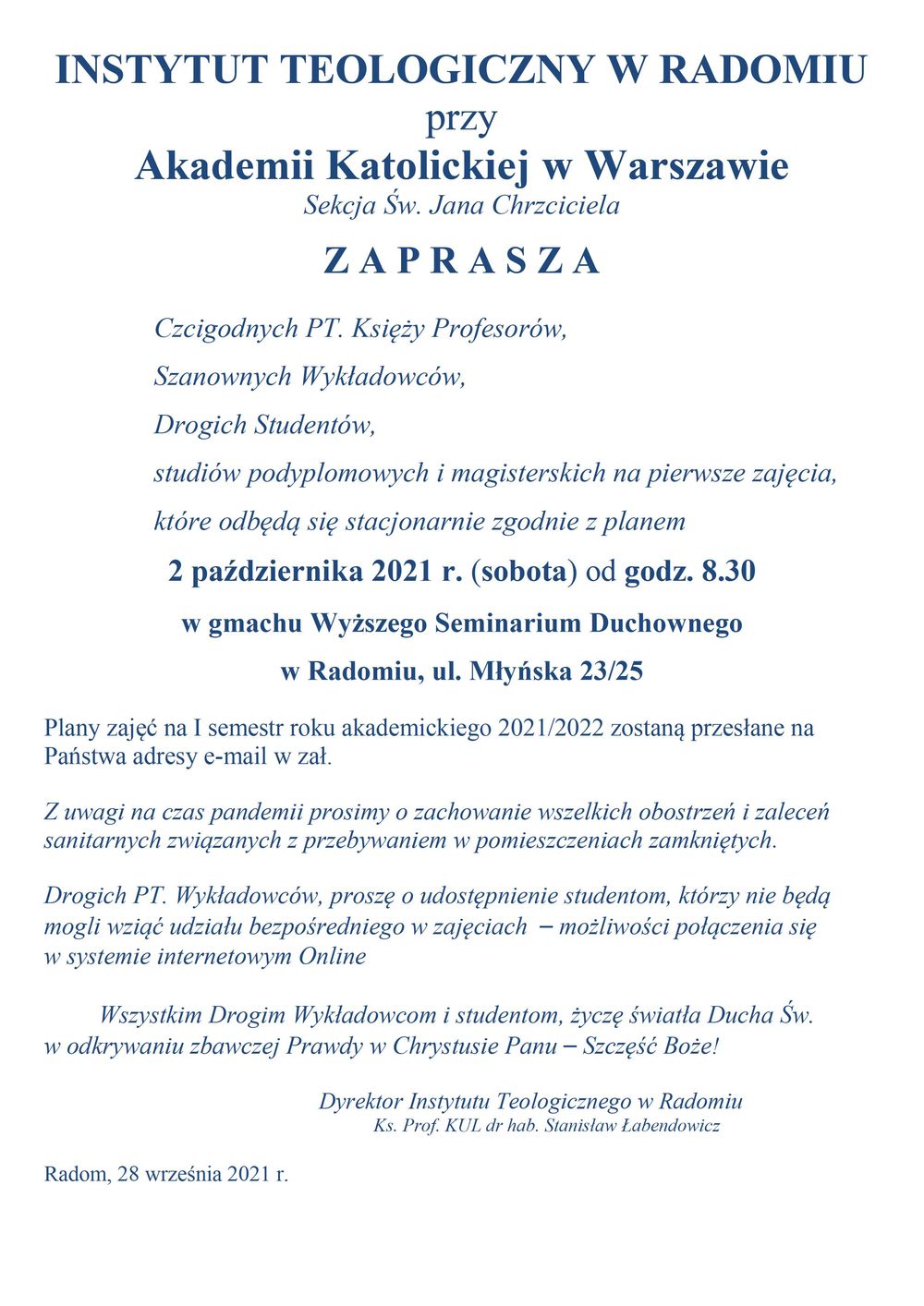W związku z sytuacją epidemiczną najbliższe zajęcia dydaktyczne w Instytucie Teologicznym w Radomiu 21 stycznia br. w piątek odbędą się jedynie w formie zdalnej. Linki będą podane na skrzynki e-mail studentów.