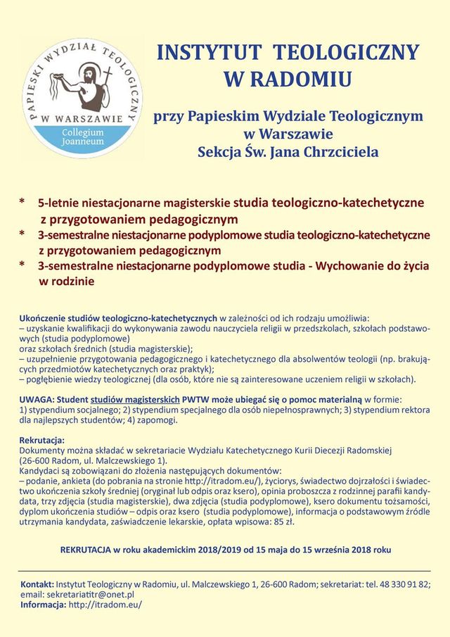 Wydział Katechetyczny Kurii Diecezji Radomskiej informuje o wznowieniu studiów magisterskich na kierunku teologiczno-katechetycznym oraz podyplomowych studiów z teologii i teologiczno-katechetycznych. Etatów katechetycznych w szkołach zdaje się nie brakować. Ale to tylko pozór.